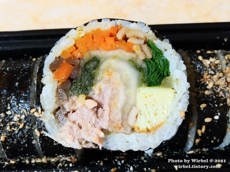 달걀, 시금치, 단무지, 어묵, 당근, 우엉, 묵은지, 참치가 들어갑니다.