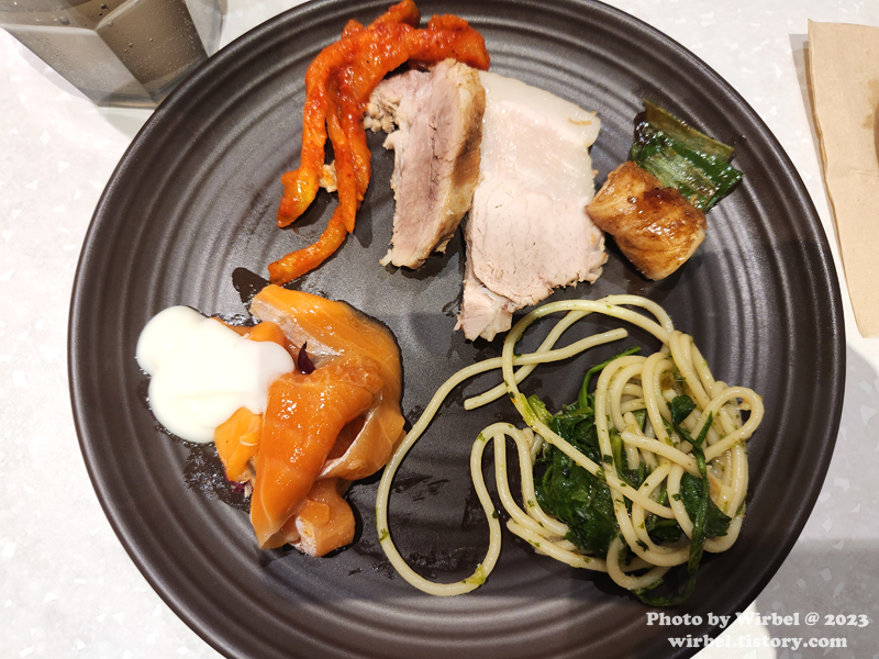 훈제연어, 미나리새우파스타, 통대파삼겹말이, 편백보쌈.