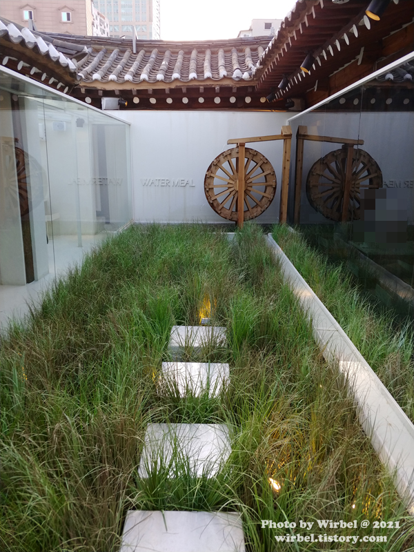 워터밀은 한옥과 양옥이 만난듯한 깔끔한 인테리어로 중앙에 있는 정원에는 물레방아가 돌아가고 있습니다.