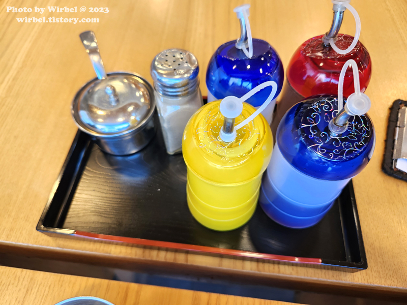 테이블에는 간장, 소금 등 양념이 있습니다.