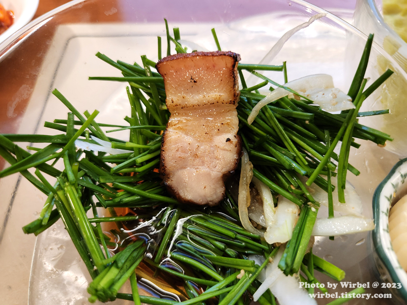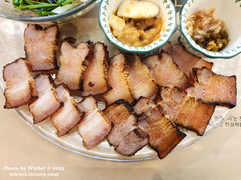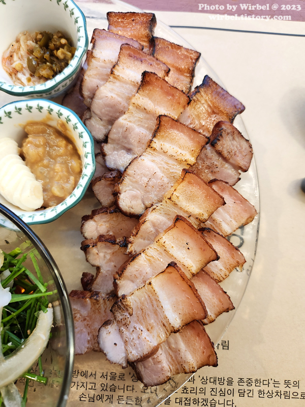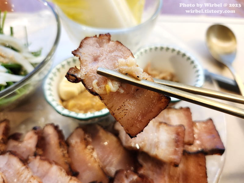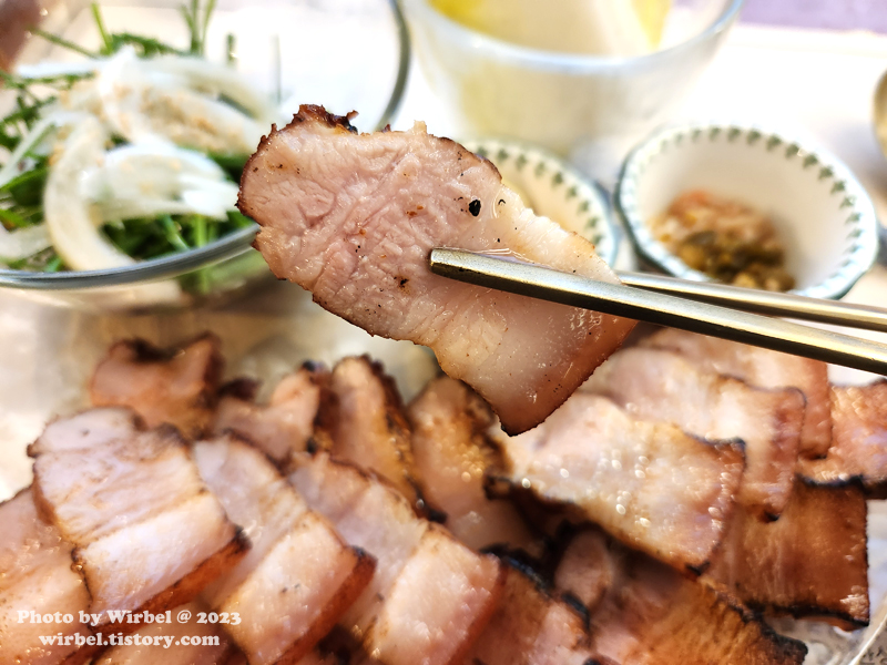 수육의 느낌이 살짝 남아 있는 삼겹살 구이로 지방 부분은 쫀득쫀득한 식감을 보여줍니다.