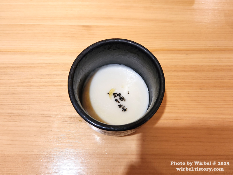 감자퓨레 트러플오일 흑임자를 곁들인 차완무시.