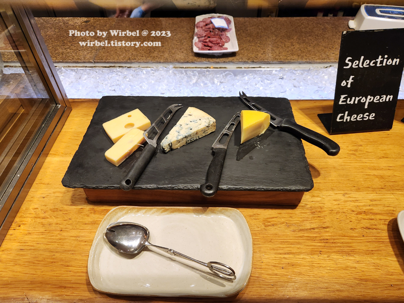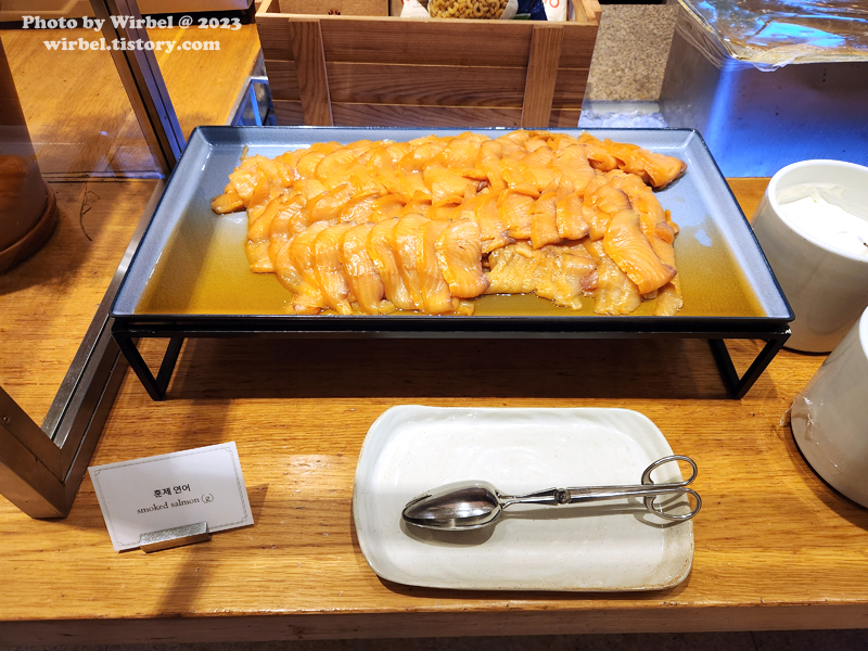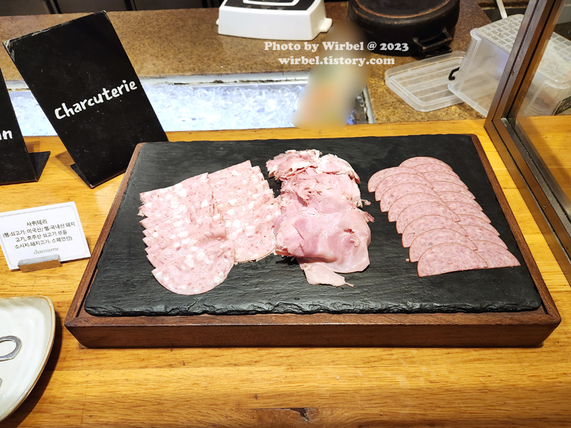 양식 코너에서 가지고 온 훈제연어, 햄, 소시지, 치즈, 베이컨, 훈제삼겹살.