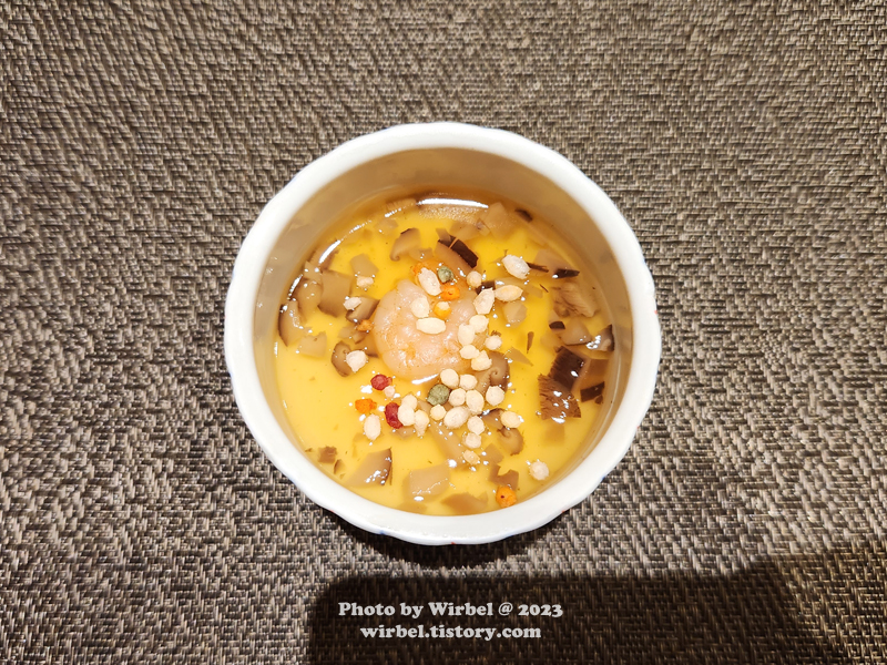 일본식 달걀찜 위에는 새우, 표고버섯 조린 것, 참쌀튀김이 얹어집니다.