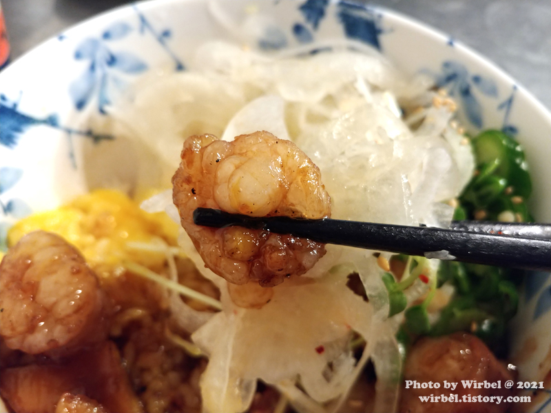 대창덮밥 곱빼기로 토실토실한 대창이 11조각 정도가 들어가 있습니다.