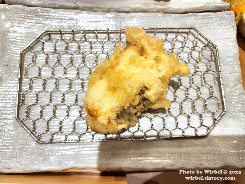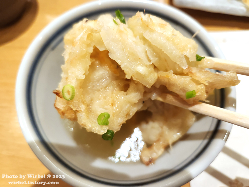 한국에서 텐동으로 먹었던 아나고튀김과는 다르게 더 생선튀김 느낌이 듭니다.