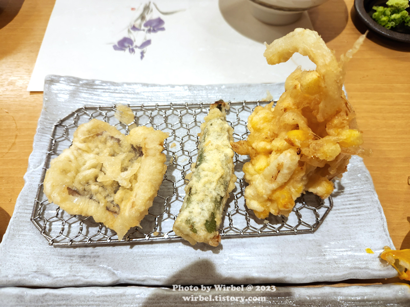 새우튀김, 전갱이튀김, 다진새우오크라튀김, 붕장어튀김, 가지튀김, 옥수수참마튀김,
