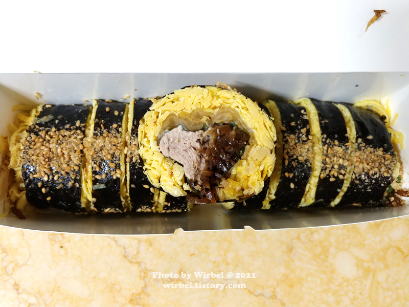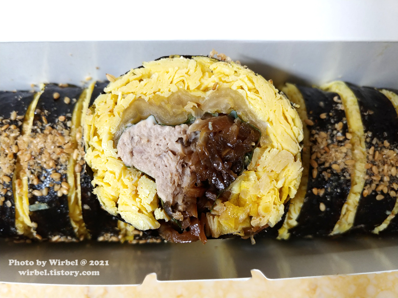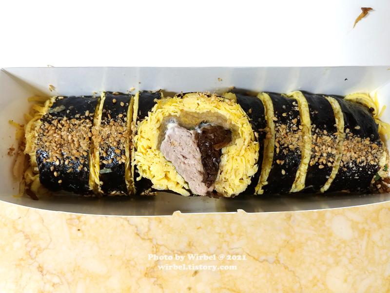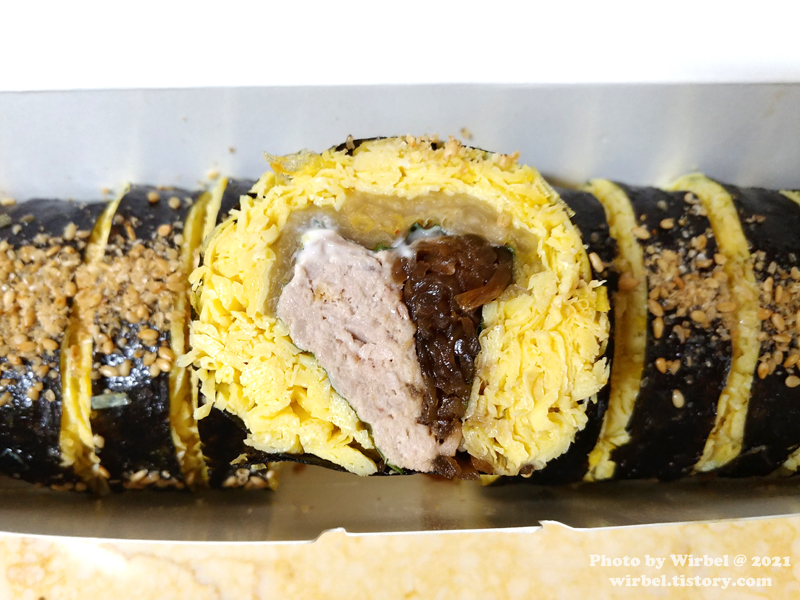 달걀지단이 얇게 있어서 부슬부슬한 식감을 보여주고 있습니다.