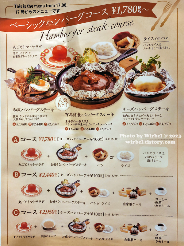<백년양식 함박스테이크 B코스>, 가격: 1,940엔 + 630엔 = 2,570엔 (한화 약 24,700원).