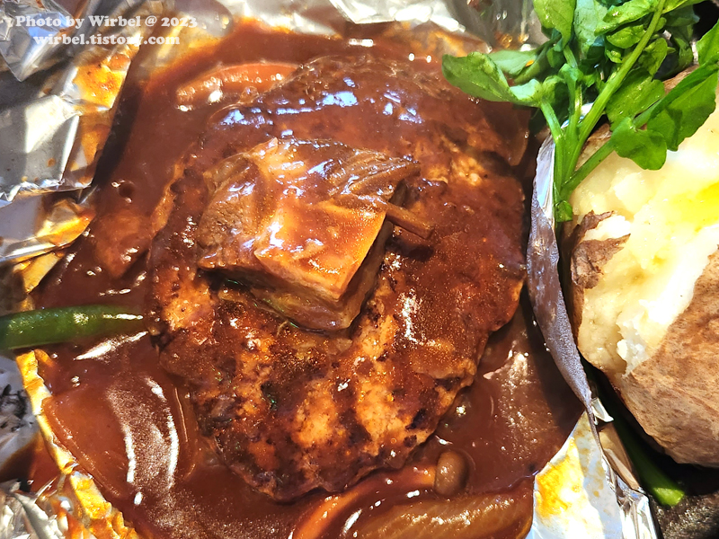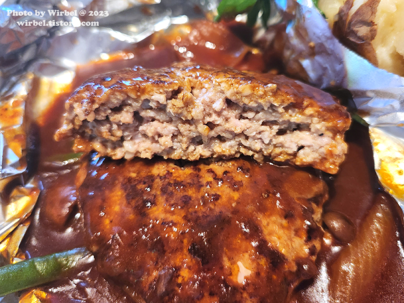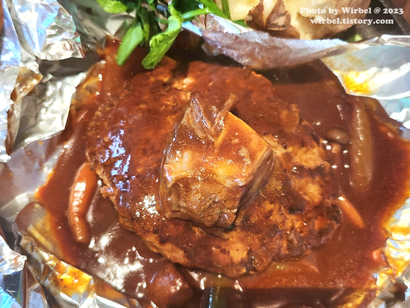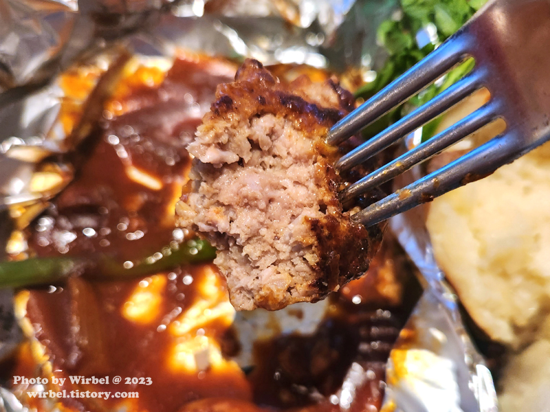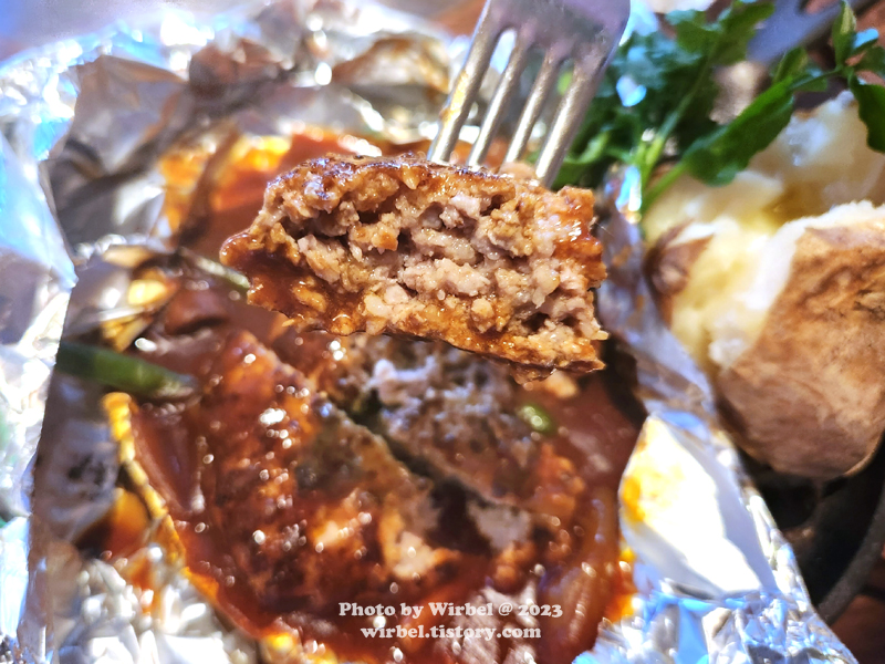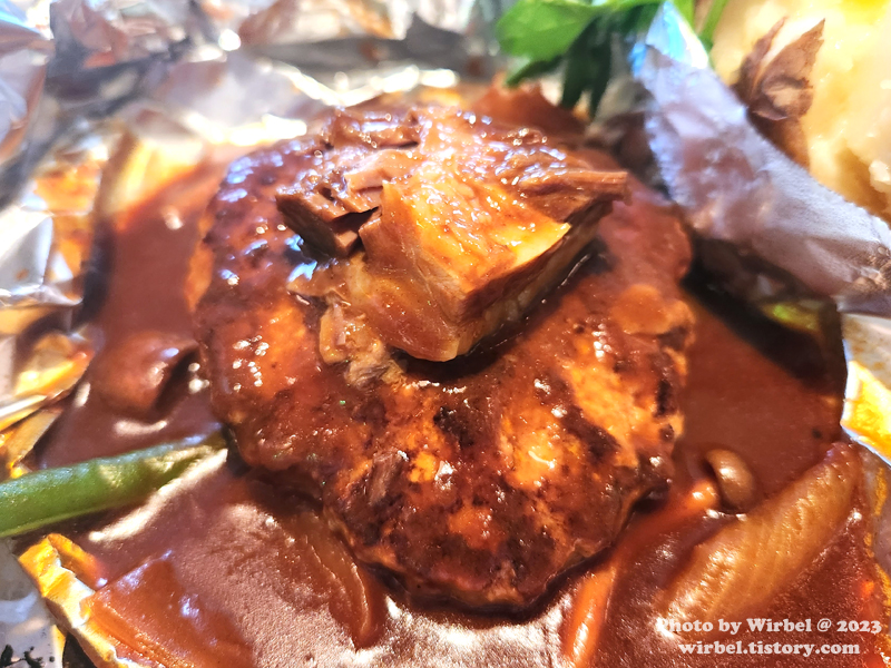 알루미늄 포일 안에 소스가 곁들여진 함박스테이크가 나옵니다.