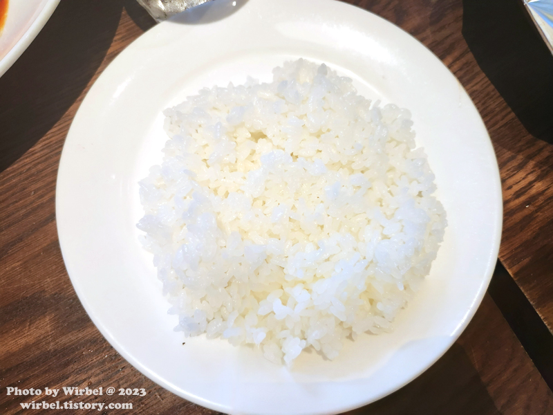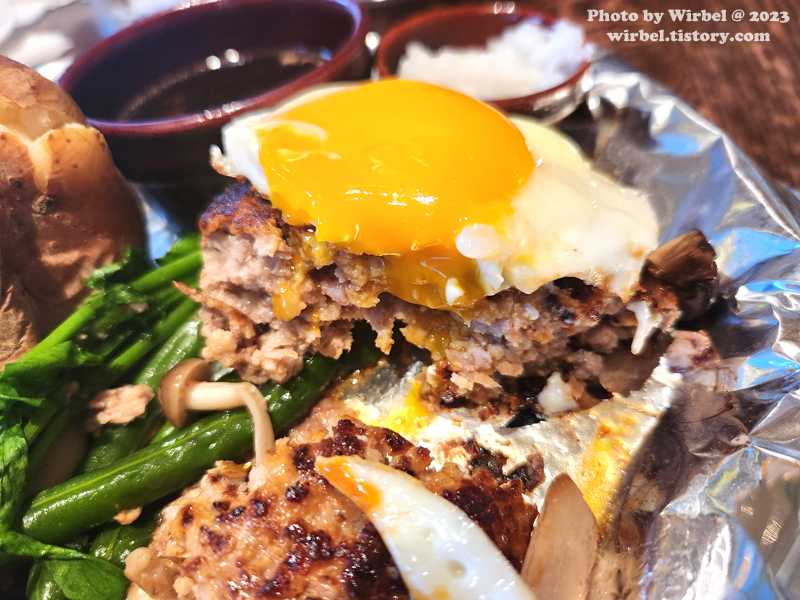 함박스테이크에 잘 삶아진 소고기 조각이 얹어져서 나오는 것이 독특하네요.