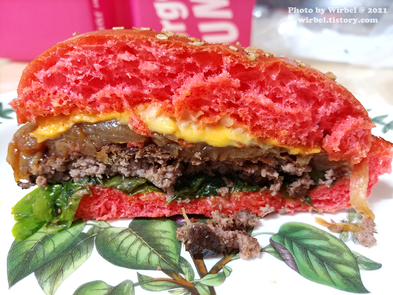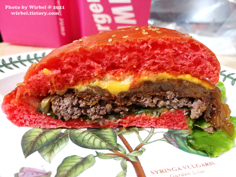 핑크번 사이에 로메인, 소고rh패티, 구운양파+스모크BBQ소스, 아메리칸치즈가 차곡차곡 쌓여 있습니다.