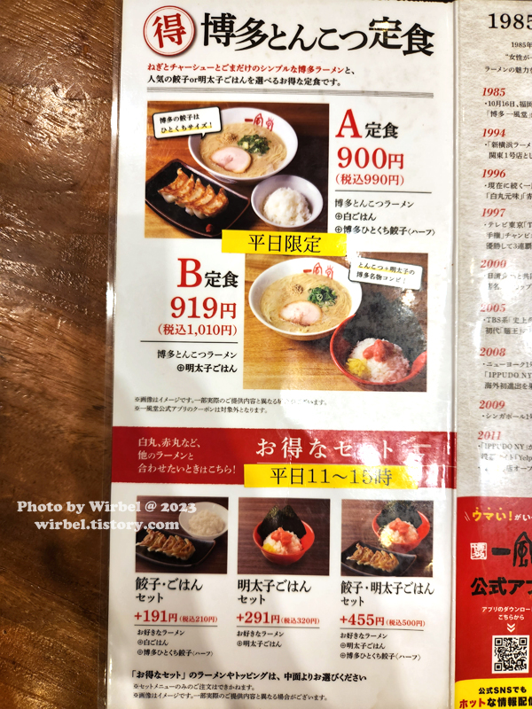<평일한정 하카타 돈코츠라멘 B세트>, 가격: 1,010엔 (한화 9,700원).