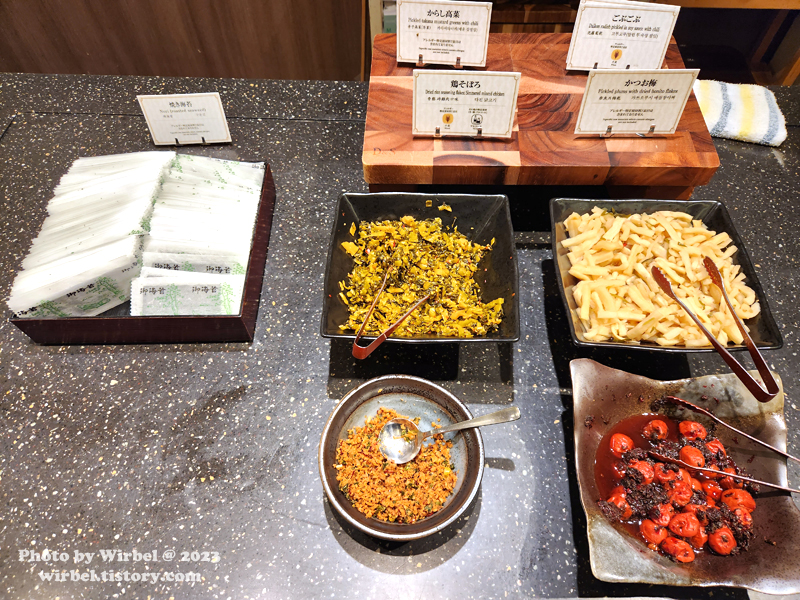 구운김, 다진 닭고기, 가쓰오부시 매실장아찌, 카라시타나카 매운 갓 절임, 고부고부 말림 무 숙성 절임.