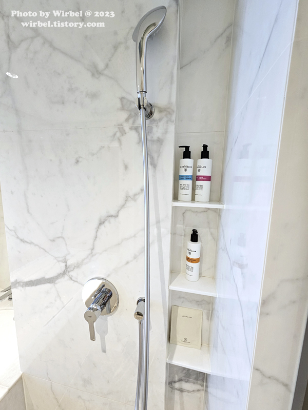 앰배서더서울풀만호텔 실내수영장 한쪽에 샤워기가 있어서 수영복 입은 상태에서 물에 씻은 후 들어가면 됩니다.