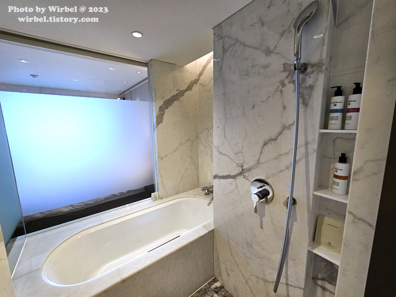 욕실은 불투명 유리로 되어 있고 하단은 투명 유리로 되어 있습니다.
