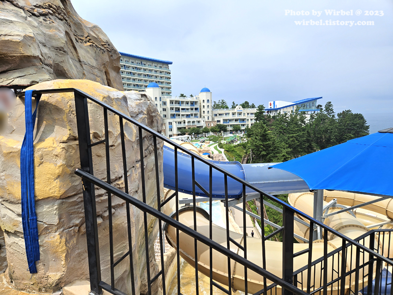 오션플레이에서 튜브 슬라이드 타워에서는 쏠비치 삼척 B동이 보입니다.