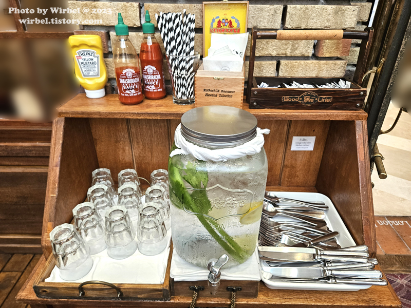 매장 한쪽 끝에 세면대가 있고 이 옆에 쟁반과 집게가 있습니다.
