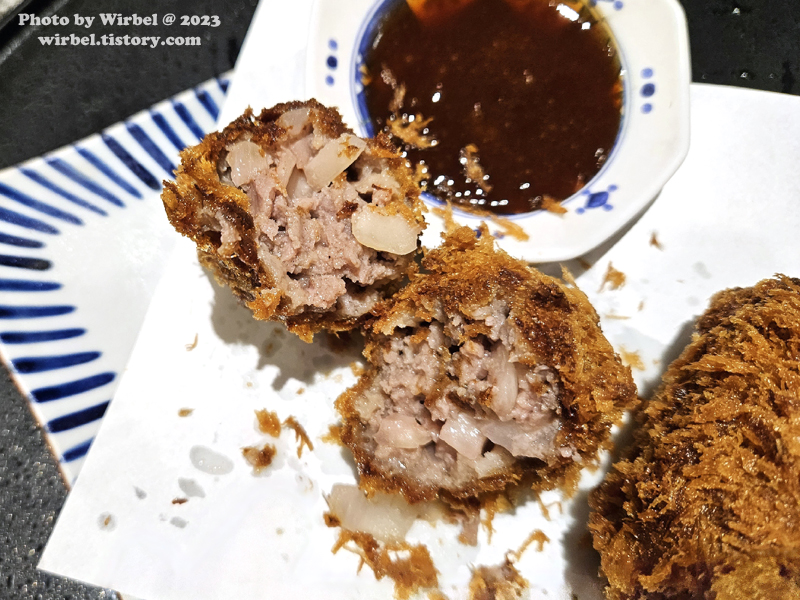 소고기와 양파를 다져 고소하게 튀겨낸 풍부한 육즙의 고에몬 커틀릿.