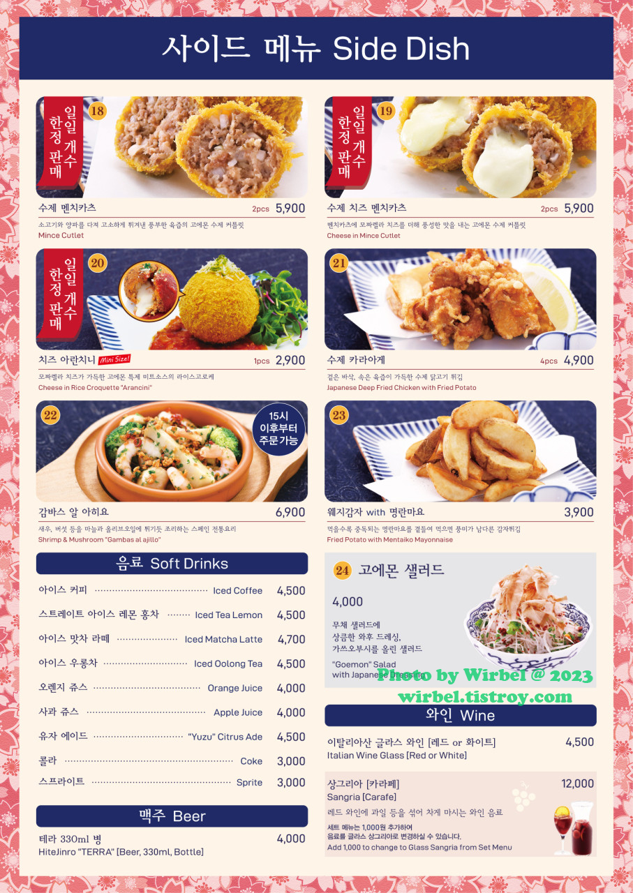 연트럴파크 요멘야 고에몬 사이드 메뉴 가격.