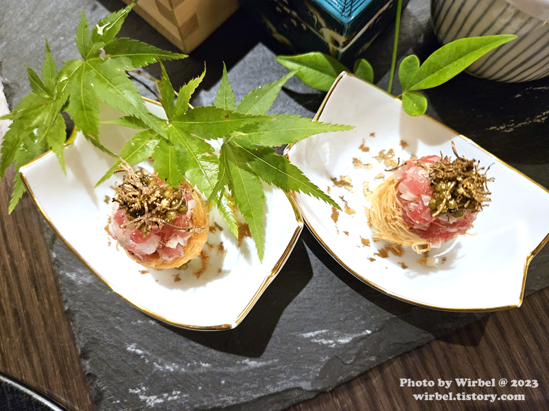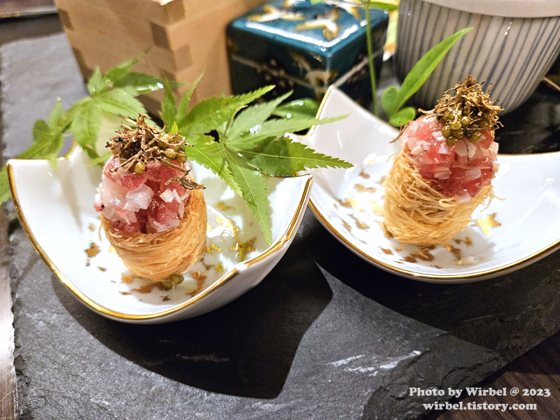 감자크림을 카다이프 튀김으로 감싸고 참치와 캐비어가 얹어져 있습니다.