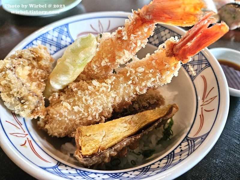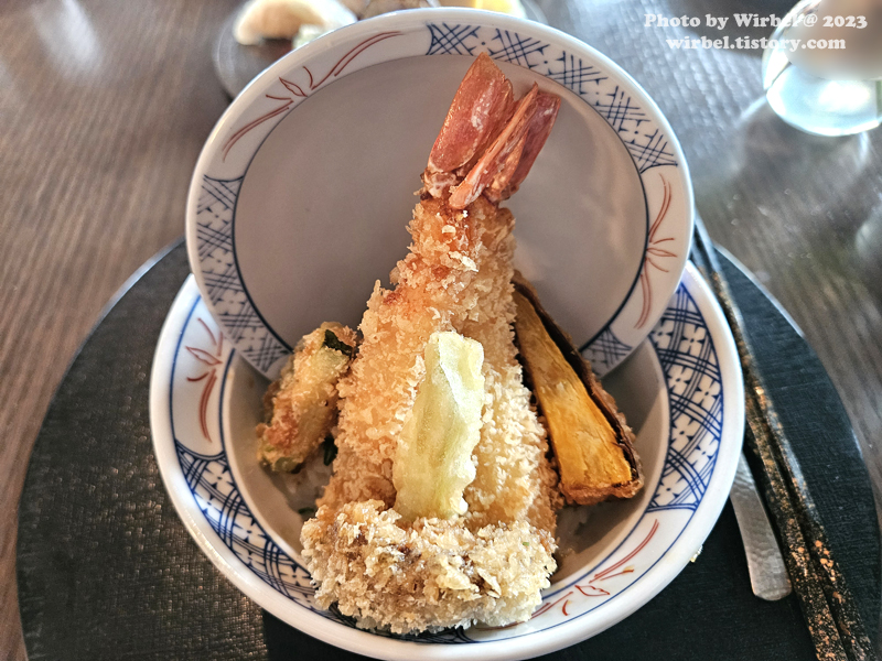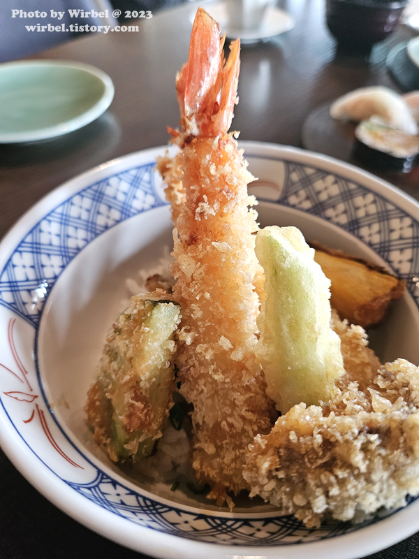 미오 런치 코스는 텐동과 스시를 고를 수 있는데 하나씩 골랐습니다.