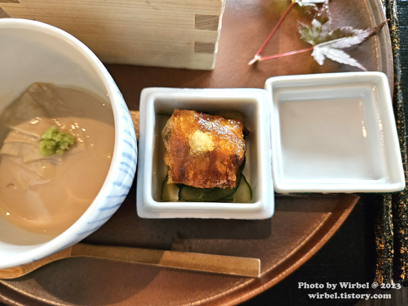 일본식 계란찜에 두유를 끊이면 생기는 막인 유바가 얹어져서 나옵니다.