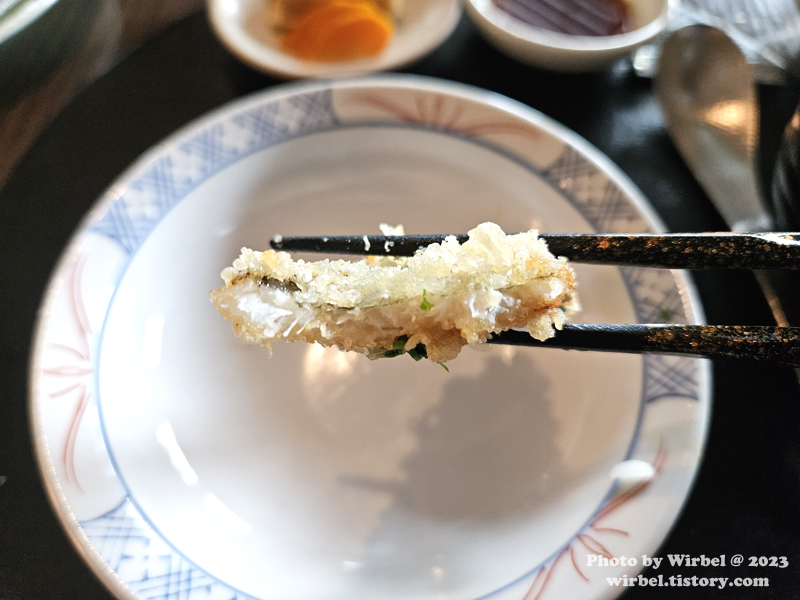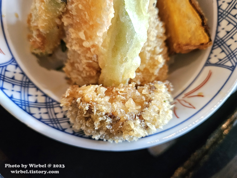 미오 덴푸라는 기름도 잘 빠져 있고 시간이 지나도 모양을 잘 유지하고 있습니다.