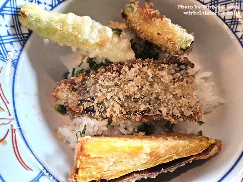 고구마튀김, 아스파라거스튀김, 바닷장어튀김, 애호박튀김(?).