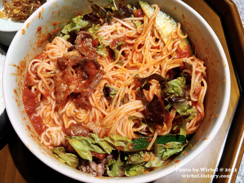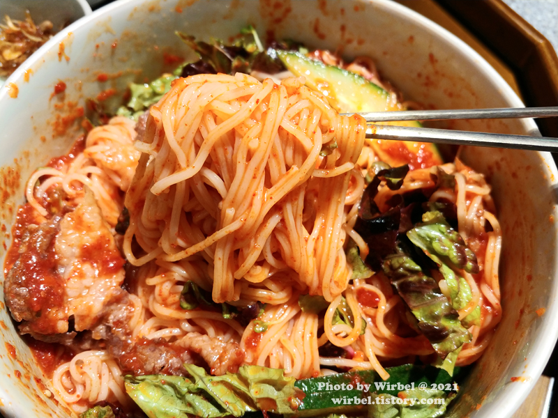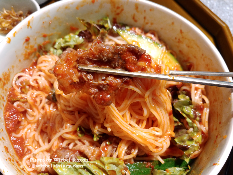 비빔국수에는 고기가 잘 어울리는 것 같습니다.