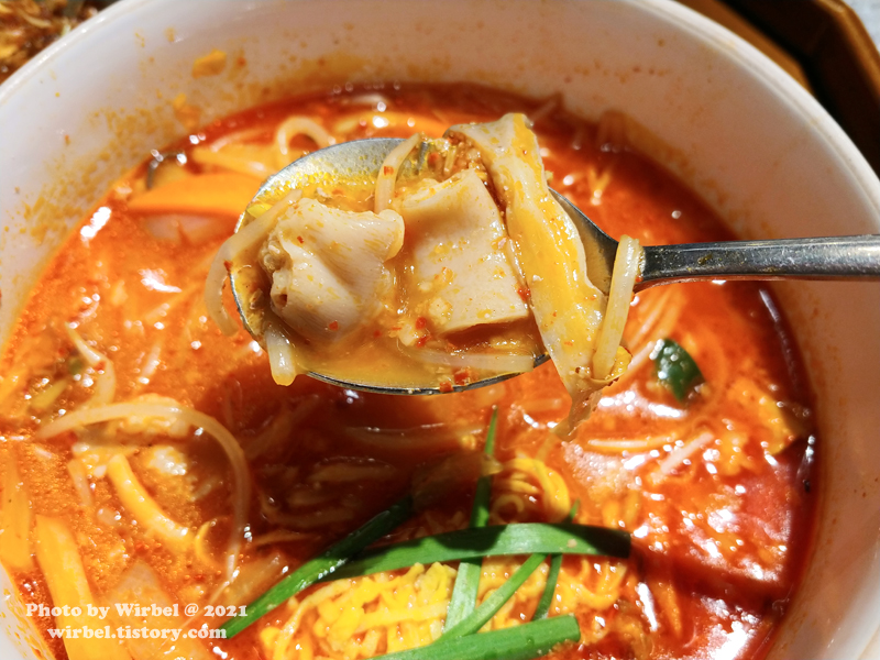 한와담에는 얼큰곱창국수가 있는데 그것과 비슷하게 식사 메뉴로 만든 것 같습니다.