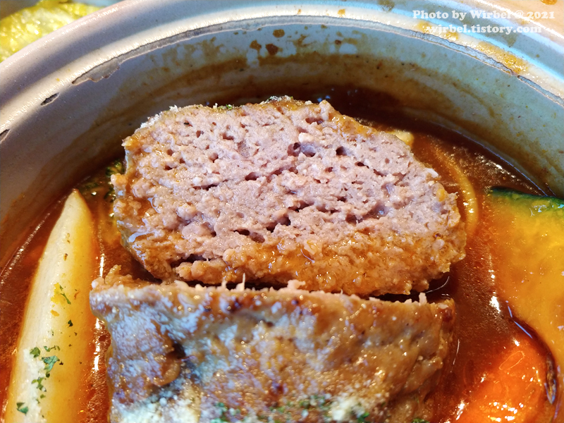 함박스테이크는 뚝배기 안에 큰 덩어리로 있습니다.