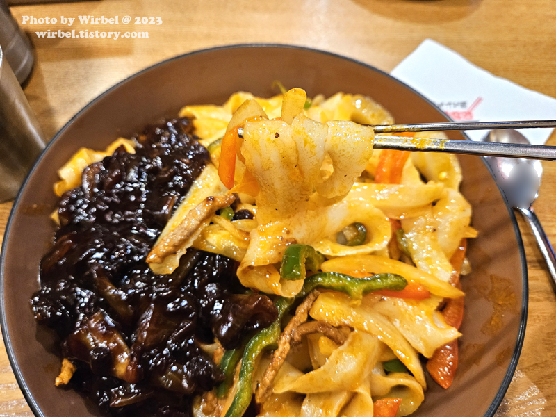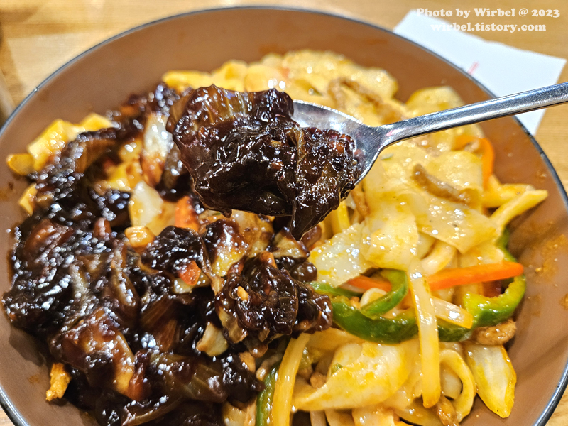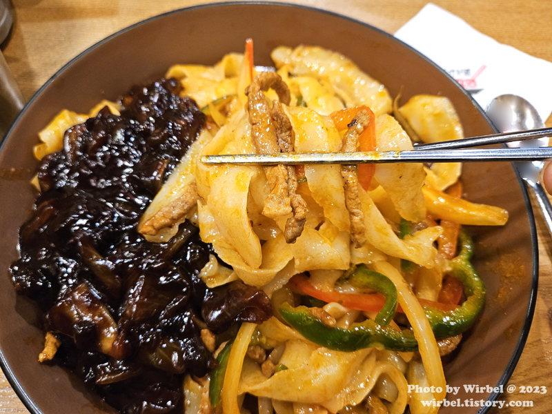 채 썬 고기와 파프리카를 면과 함께 볶았고 한쪽에 짜장이 얹어서 나옵니다.