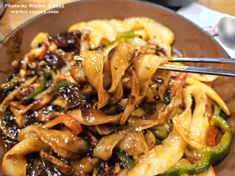 두께가 조금씩 다른 도삭면으로 유슬볶음이라서 고추기름으로 볶아졌습니다.