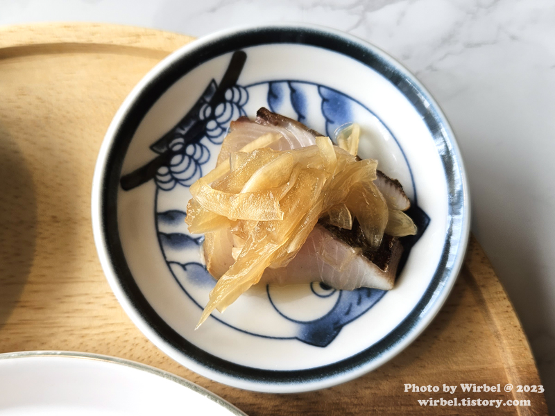 <훈연된 삼치사시미와 양파절임 / Smoked Spanish Mackerel, Onions>.