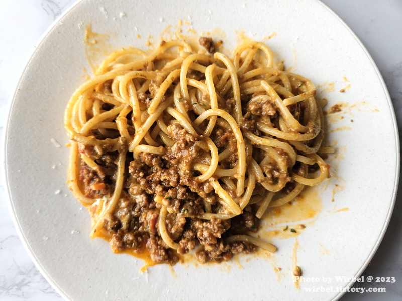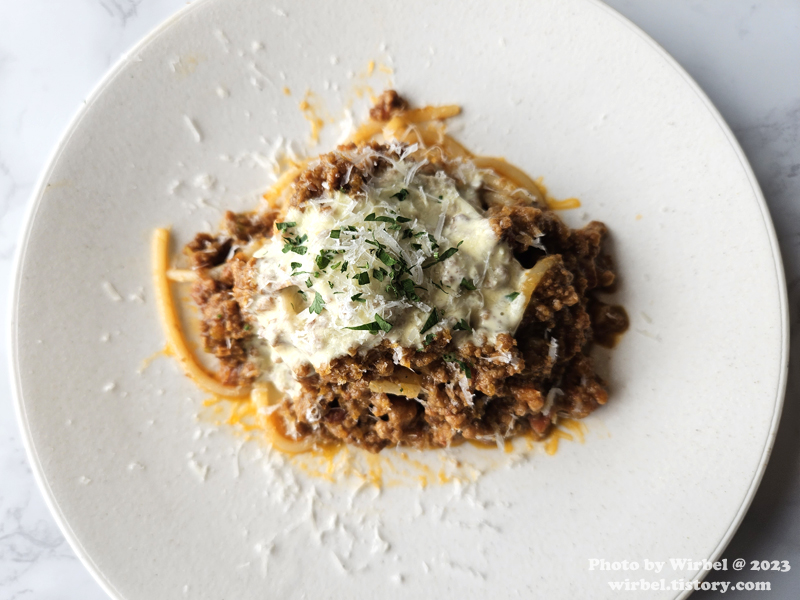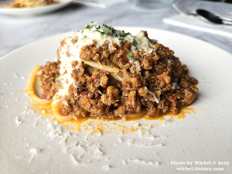 소고기에 채소, 허브, 토마토를 베이스로 끓여낸 라구 소스는 화이트 와인으로 졸인다고 합니다.