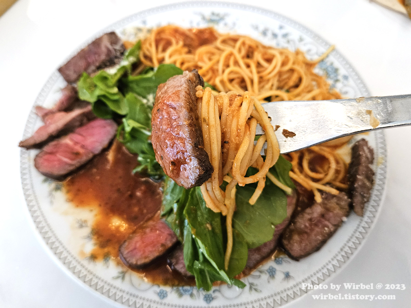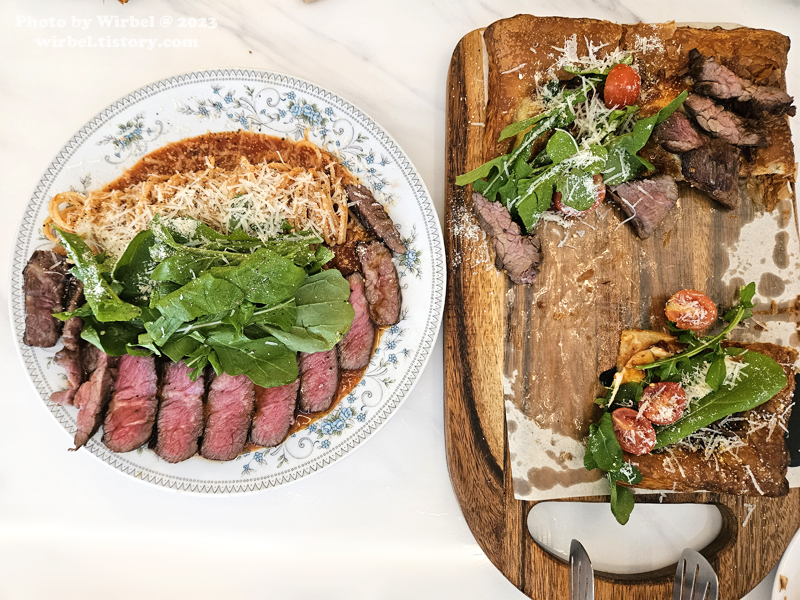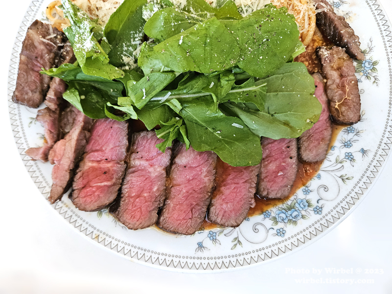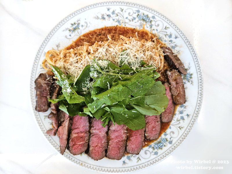 살치살 스테이크를 가득 올린 스테이크 파스타.