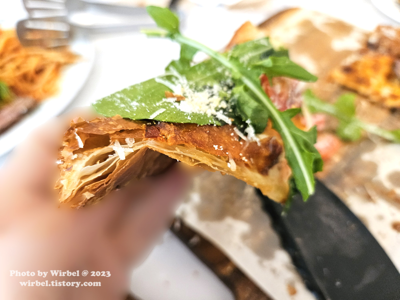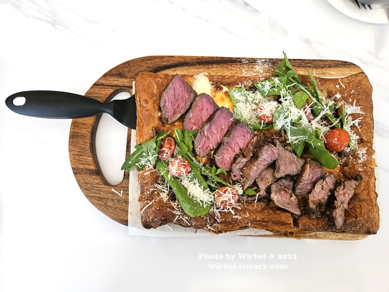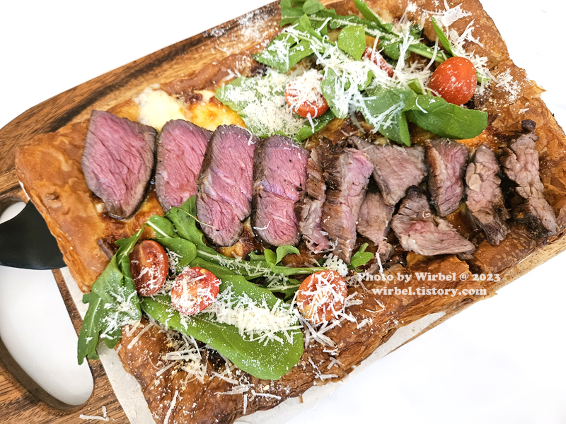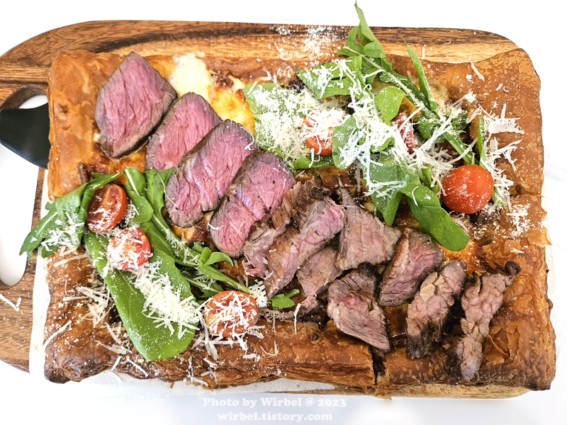일반적인 도우가 아닌 페스츄리 위에 치즈와 살치살 스테이크가 얹어져서 나옵니다.