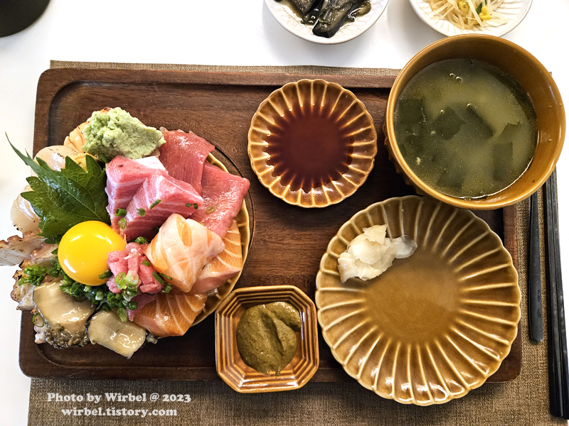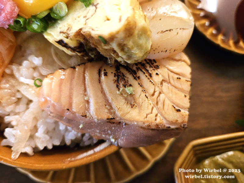 <참치뱃살, 등살, 생연어, 가리비관자, 돌문어, 찜전복 덮밥>.