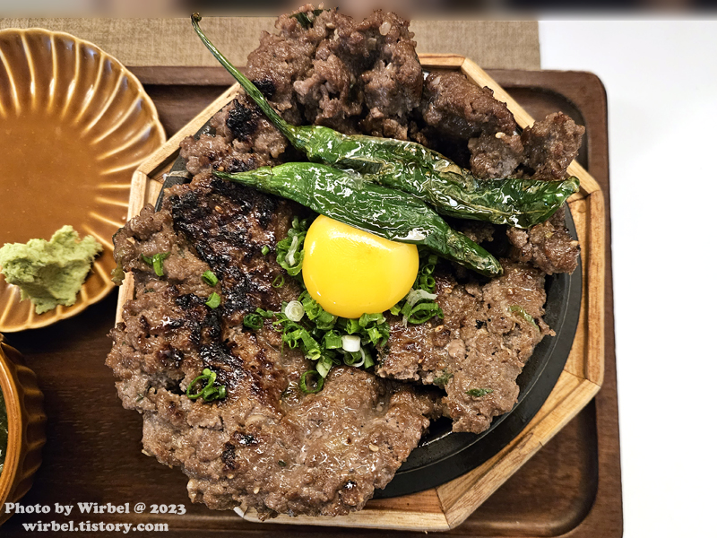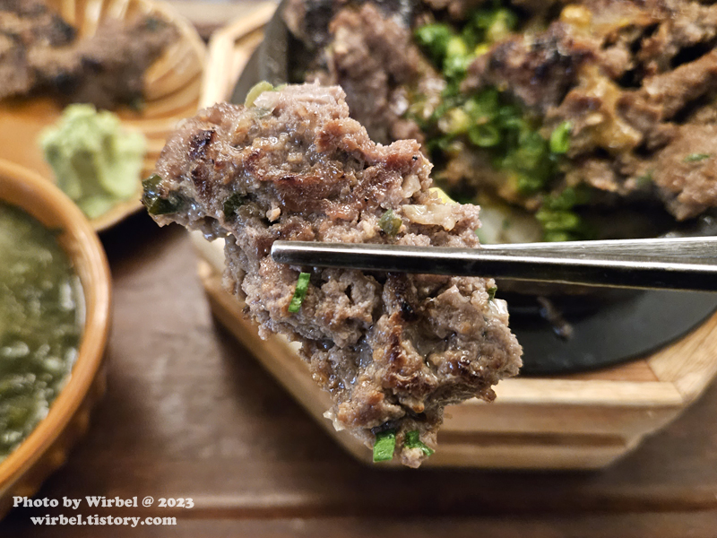 떡갈비 위에는 달걀노른자, 고추구이, 파가 얹어져서 나옵니다.