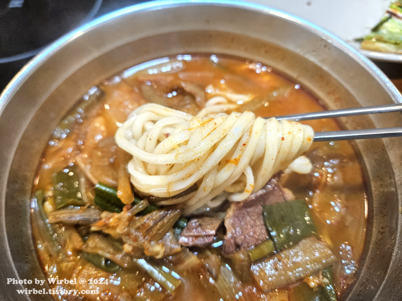 육개장에 밥 대신에 칼구수가 들어 있습니다.