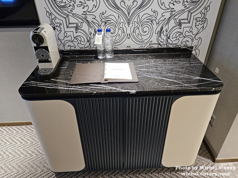 문을 열면 냉장고가 있고 위에는 네스프레소 머신이 있습니다.