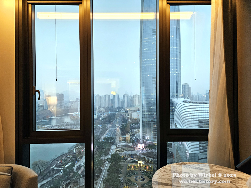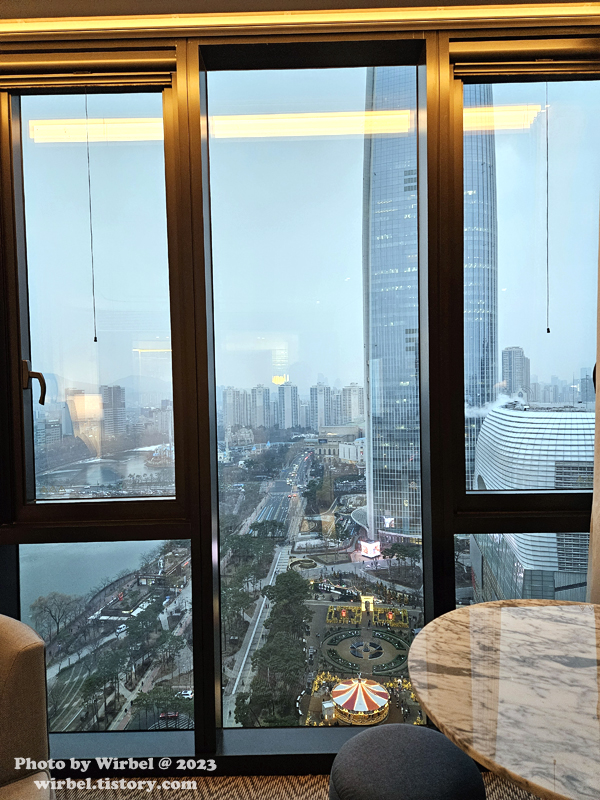 소피텔앰배서더서울 럭셔리레이크룸에서 석촌호수와 롯데월드타워가 보입니다.