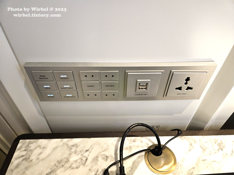 마스터 컨트롤과 USB 충전포트 2개는 침대 양쪽에 있습니다.