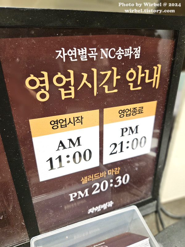 자연별곡 NC송파점 영업시간은 11:00 ~ 21:00 입니다.