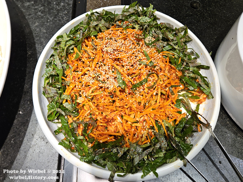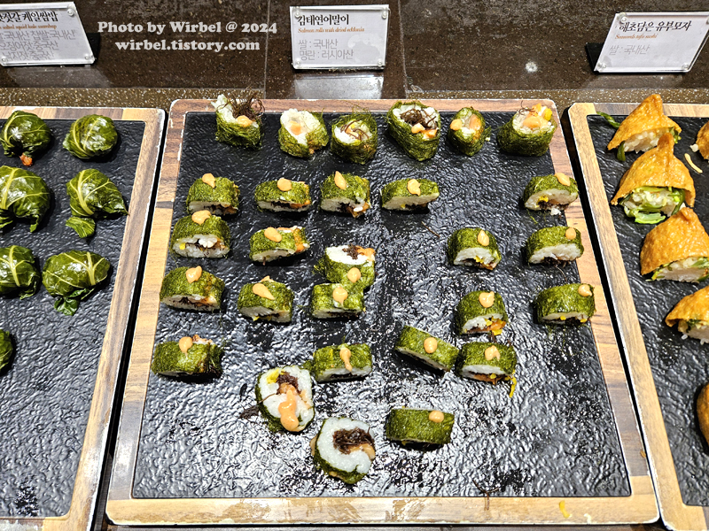 밀전병, 쌈미역, 해초, 겨자소스, 청어알젓 등.