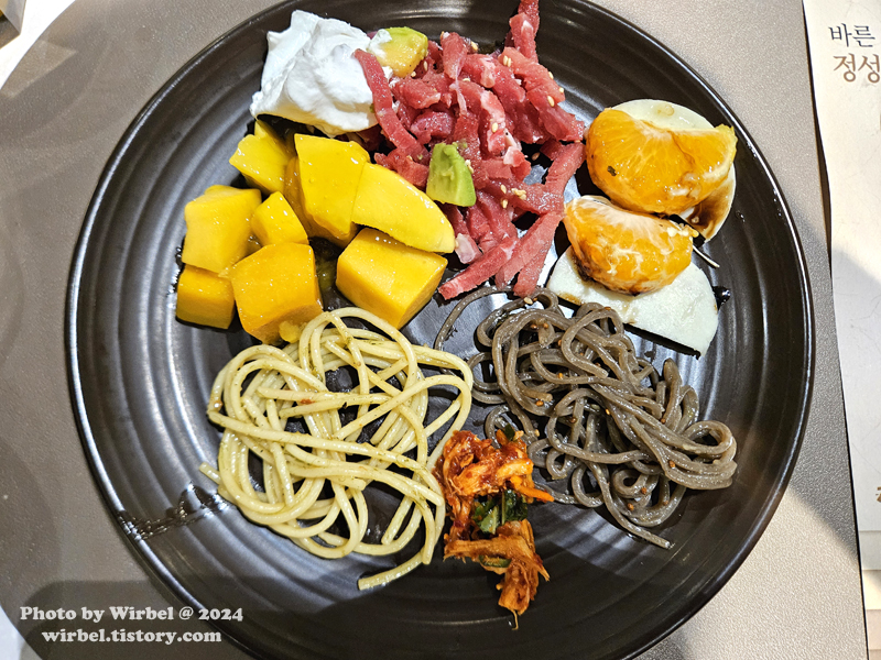 매생이가리비파스타, 매콤닭무침, 들기름메밀골동면, 감귤카프레제, 육회, 망고샐러드.