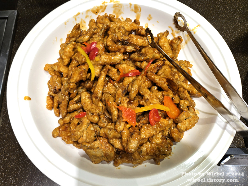 장어강정, 치킨강정, 표고버섯탕수, 돼지양념구이, 마늘종치킨스테이크, 삼채고추장구이.