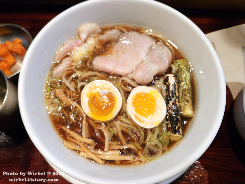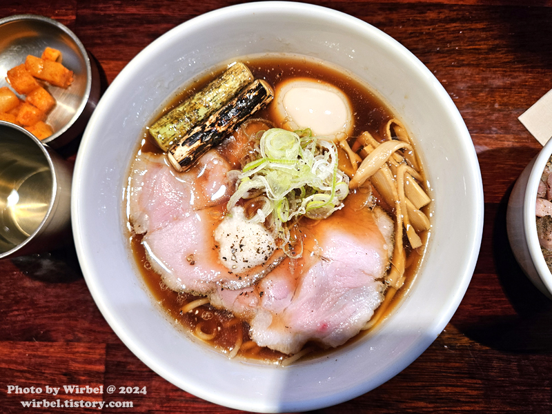 토핑으로 수비드차슈 2개, 맛계란 1개, 구운 대파 2개, 멘마, 파, 마가 얹어져서 나옵니다.