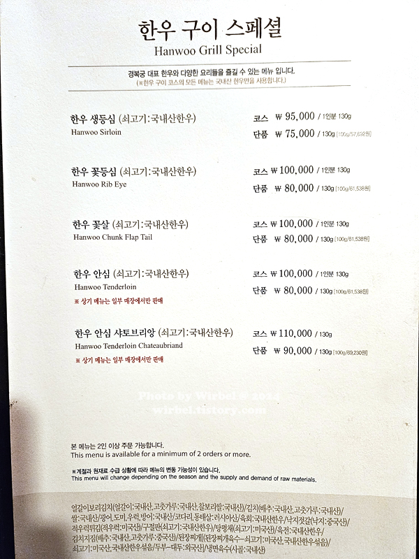 경복궁 소고기 생등심, 꽃등심, 꽃살, 안심은 한우이고 갈비는 미국산입니다.